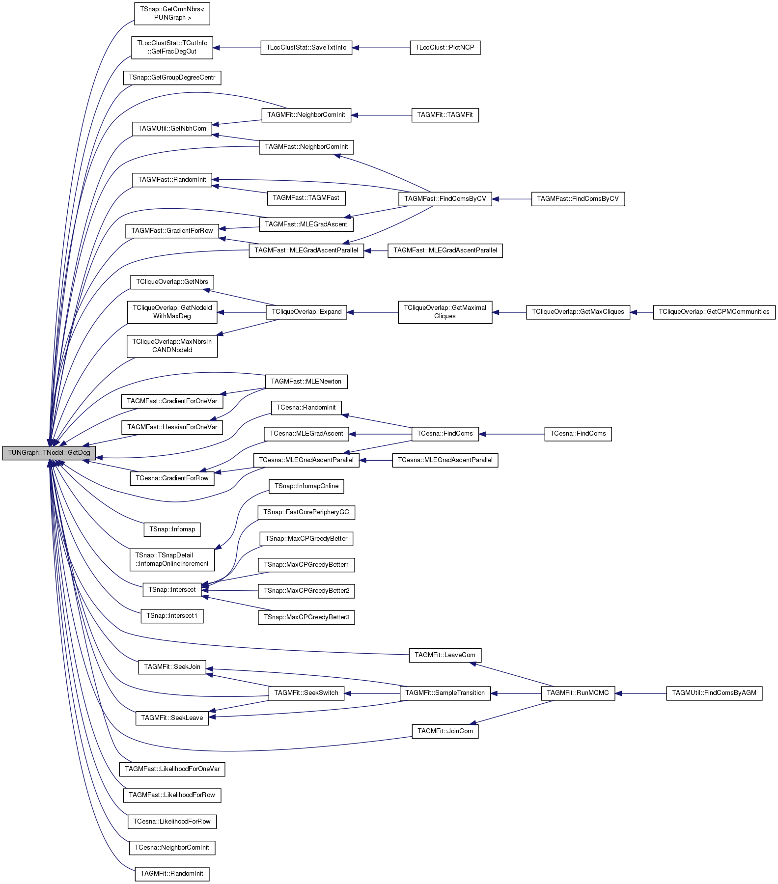 Referenced by TSnap::GetCmnNbrs< PUNGraph >(), TLocClustStat::TCutInfo::GetFracDegOut(), TSnap::GetGroupDegreeCentr(), TAGMUtil::GetNbhCom(), TCliqueOverlap::GetNbrs(), TCliqueOverlap::GetNodeIdWithMaxDeg(), TAGMFast::GradientForOneVar(), TAGMFast::GradientForRow(), TCesna::GradientForRow(), TAGMFast::HessianForOneVar(), TSnap::Infomap(), TSnap::TSnapDetail::InfomapOnlineIncrement(), TSnap::Intersect(), TSnap::Intersect1(), TAGMFit::JoinCom(), TAGMFit::LeaveCom(), TAGMFast::LikelihoodForOneVar(), TAGMFast::LikelihoodForRow(), TCesna::LikelihoodForRow(), TCliqueOverlap::MaxNbrsInCANDNodeId(), TAGMFast::MLEGradAscent(), TAGMFast::MLEGradAscentParallel(), TCesna::MLEGradAscentParallel(), TAGMFast::MLENewton(), TAGMFast::NeighborComInit(), TAGMFit::NeighborComInit(), TCesna::NeighborComInit(), TAGMFast::RandomInit(), TAGMFit::RandomInit(), TCesna::RandomInit(), TAGMFit::SeekJoin(), TAGMFit::SeekLeave(), and TAGMFit::SeekSwitch().